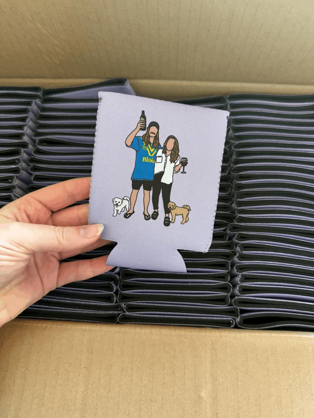 My fiancé and I ordered 100 customised stubbie coolers in the A004 design for our wedding. We added in a custom colour hand-drawn family portrait and selected a photo of us and separate photos of our two dogs in our order form. We received the illustration within a few hours of submitting our order and it was absolutely perfect! We were also able to make some small changes to add in details that weren't in the original photo. The attention to detail and super fast turn around was really impressive and much appreciated. Communication via email was really easy and it was great to be able to approve the final mock up of the design before going to print. We received the order within a 2 weeks from ordering which we couldn't believe. The whole process was so fast, easy and straightforward and we're so so thrilled with the final product. We would 100% recommend Boozie's!